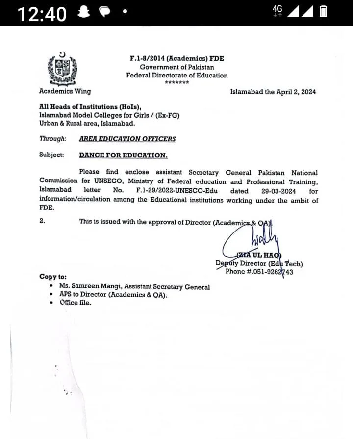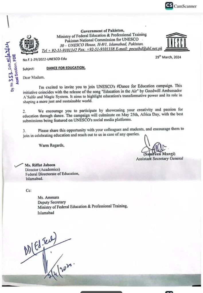 وزارت تعلیم بھی تعلیم کے نام پر ڈانس پارٹیوں کا حصہ بن گئی ،وفاقی نظامت تعلیمات کو غیر سرکاری تنظیم یونیسکو کے کہنے پر ڈانس مقابلے کروانے کا نوٹفکیشن جاری کر دیا گیا،25 مئی کو افریقہ ڈے پر ایجوکیشن ڈانس ریلیز کرنے کا اعلان کیا گیا ہے، جاری نوٹفکیشن میں کہا گیا ہے کہ تمام تعلیمی ادارے بچیوں اور بچوں سے ڈانس پرفارم کروائیں اور ان کی ویڈیو شئیر کریں نوٹیفکیشن وفاقی وزارت تعلیم و پروفیشنل ٹریننگ ،پاکستان نیشنل کمیشن فار یونیسکو کی جانب سے جاری کیا گیا ہے،اسکے بعد دوسرا نوٹفکیشن 2 اپریل کو حکومت کی طرف سے جاری کیا گیا جس میں کہا گیا کہ 25 مئی کو تعلیمی اداروں میں ڈانس والے نوٹفکیشن پر عملدرآمد کیا جائے،