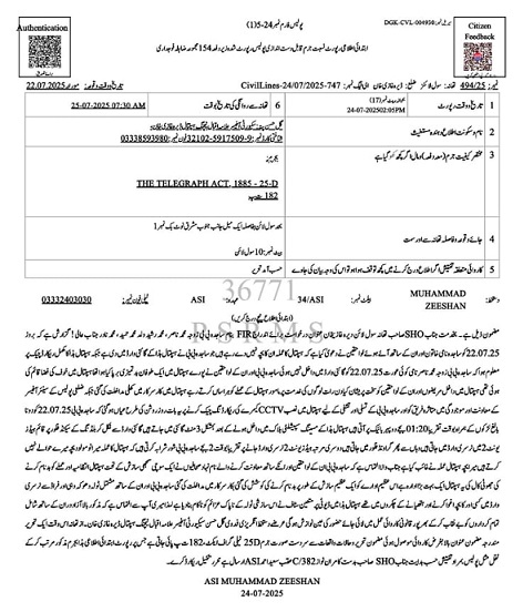 تحقیقات مکمل ہونے پر تھانہ سول لائن پولیس نے مقدمہ نمبر 494/25 درج کیا، جو تعزیراتِ پاکستان کی دفعہ 182 اور ٹیلی گراف ایکٹ کے تحت درج ہوا۔ مقدمہ میں ساجدہ بی بی زوجہ محمد ناصر، محمد رشید اور محمد نادر کو نامزد کیا گیا، اور خاتون کو گرفتار کر کے حوالات میں بند کر دیا گیا۔
