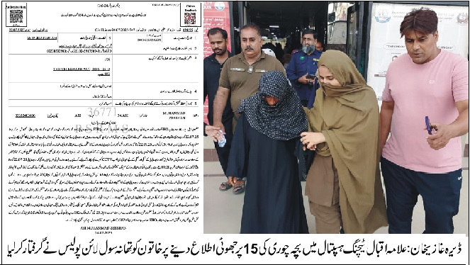 ڈیرہ غازی خان (باغی ٹی وی رپورٹ)علامہ اقبال ٹیچنگ ہسپتال ڈیرہ غازی خان میں بچہ چوری کی جھوٹی اطلاع دینے پر پولیس نے خاتون سمیت دو افراد کے خلاف مقدمہ درج کر لیا، خاتون کو گرفتار کر لیا گیا۔ سی سی ٹی وی فوٹیج، میڈیکل بورڈ اور تحقیقاتی ٹیم کی رپورٹ نے جھوٹ کا پردہ چاک کر دیا۔ ایم ایس ڈاکٹر شاہد حسین مگسی نے واقعے کو ہسپتال کو بدنام کرنے کی منظم سازش قرار دیا۔