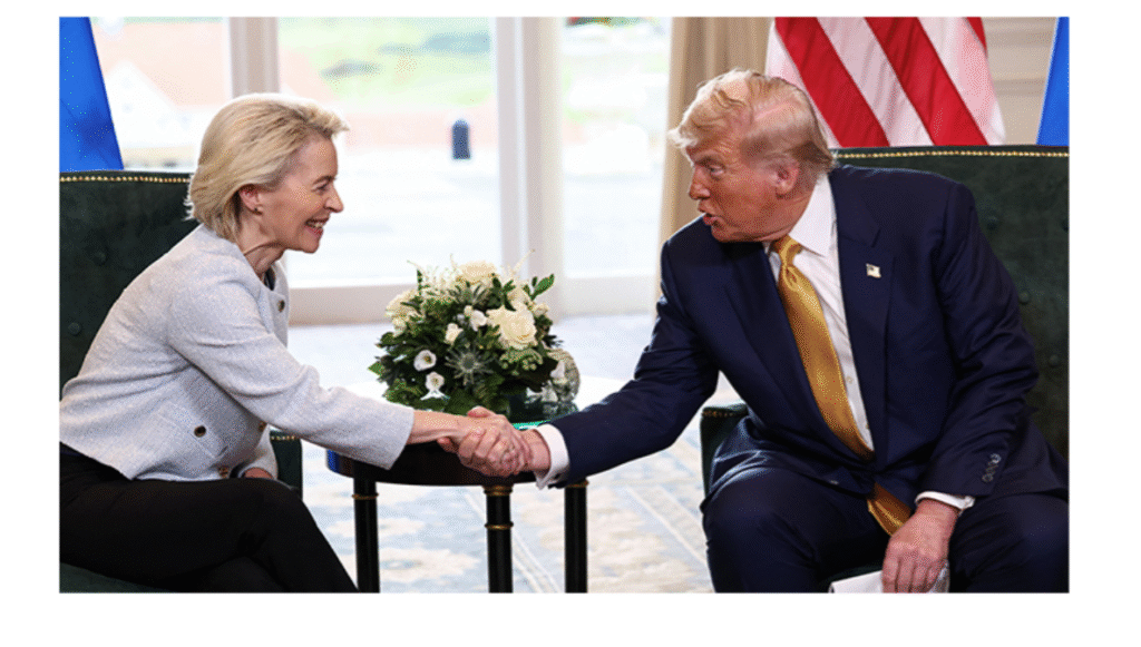 اسکاٹ لینڈ میں یورپی کمیشن کی سربراہ اُرسلا وان سے ملاقات کے بعد ٹرمپ نے اعلان کیا کہ امریکا اور یورپی یونین کے درمیان تجارتی معاہدہ ہوگیا، معاہدہ سب کو مبارک ہو،ہم ایک معاہدے پر پہنچ چکے ہیں جو سب کے لیے اچھا ہوگا، یورپی مصنوعات پر 15 فیصد ٹیکس عائد ہوگا اور یورپی یونین امریکی فوجی ساز و سامان خریدے گا،یورپی یونین امریکی توانائی شعبے سے 750 ارب ڈالر کی خریداری کرے گا جبکہ یورپی یونین امریکا میں 600 ارب ڈالر کی سرمایہ کاری کرے گا، یورپی یونین کے ساتھ تجارتی معاہدہ اب تک کا سب سے بڑا معاہدہ ہے، معاہدہ گاڑیوں کے لیے بہت اچھا ہوگا اور اس سے زراعت پر بھی بڑا اثر پڑے گا۔