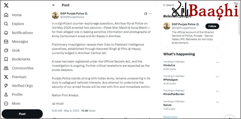 بھارتی پنجاب پولیس کے ڈائریکٹر جنرل (DGP Punjab Police) کی جانب سے 3 مئی 2025 کو ایکس (سابق ٹویٹر) پر جاری بیان میں انکشاف کیا گیا ہے کہ امرتسر رورل پولیس نے ایک بڑی جوابی جاسوسی کارروائی کے دوران دو افراد پلک شیر مسیح اور سورج مسیح کو گرفتار کر لیا ہے۔ گرفتار افراد پر الزام ہے کہ انہوں نے امرتسر میں واقع فوجی چھاؤنیوں اور فضائی اڈوں کی حساس تصاویر اور معلومات افشاء کر کے قومی سلامتی کو خطرے میں ڈالا۔