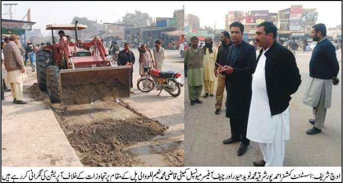 گزشتہ روز اوچ شریف کے عباسیہ روڈ اور للووالی پل کے قریب غیر قانونی تجاوزات کے خلاف آپریشن کے دوران اسسٹنٹ کمشنر نے اینٹی انکروچمنٹ ٹیم کو ہدایات دیں۔ ان کے ہمراہ چیف آفیسر میونسپل کمیٹی اوچ شریف قاضی محمد نعیم بھی موجود تھے۔ اسسٹنٹ کمشنر نے کہا کہ صفائی ستھرائی، سیوریج لائنوں کی صفائی، آوارہ کتوں کی تلفی، عملے کی حاضری، اور واٹر فلٹریشن پلانٹس کے مکمل فعال ہونے سمیت دیگر امور کی نگرانی کی جائے گی۔