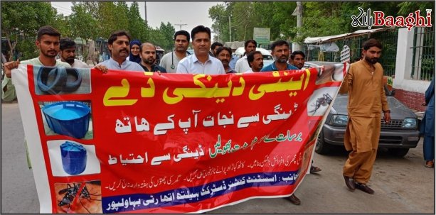 اوچ شریف (باغی ٹی وی،نامہ نگار حبیب خان) ورلڈ ڈینگی ڈے کے عالمی دن کے موقع پر تحصیل ہیڈکوارٹر اسپتال (THQ) احمد پور شرقیہ میں ڈینگی بخار سے بچاؤ اور عوامی شعور اجاگر کرنے کے لیے ایک بیداری واک کا انعقاد کیا گیا، جس میں سرکاری اداروں، سول سوسائٹی اور تعلیمی شعبے سے وابستہ افراد نے بھرپور شرکت کی۔ آگاہی واک کی قیادت اسسٹنٹ کمشنر احمد پور شرقیہ نوید حیدر نے کی، جبکہ فوکل پرسن برائے ڈینگی اور انسپکٹر عمران حیدر سیال، اسپتال کے ایم ایس، محکمہ صحت کے اہلکار، بلدیاتی اداروں کے نمائندے، اسکولوں کے طلبا، ٹیچرز اور شہری بڑی تعداد میں شریک ہوئے۔