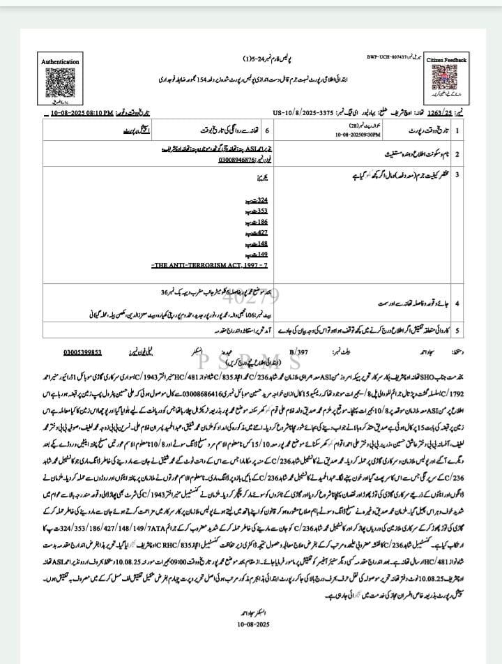 پولیس ترجمان کے مطابق، 10 اگست 2025 کو صبح 8 بجے خواجہ مرید حسین نے پولیس کو اطلاع دی کہ کچھ افراد ان کی 5 کنال اراضی پر زبردستی قبضہ کر رہے ہیں۔ اس اطلاع پر تھانہ اوچ شریف سے ایک پولیس ٹیم جس میں اے ایس آئی نذیر احمد، کانسٹیبل محمد شاہد حسین، اور ہیڈ کانسٹیبل محمد شاہ نواز شامل تھے، موقع پر پہنچی۔