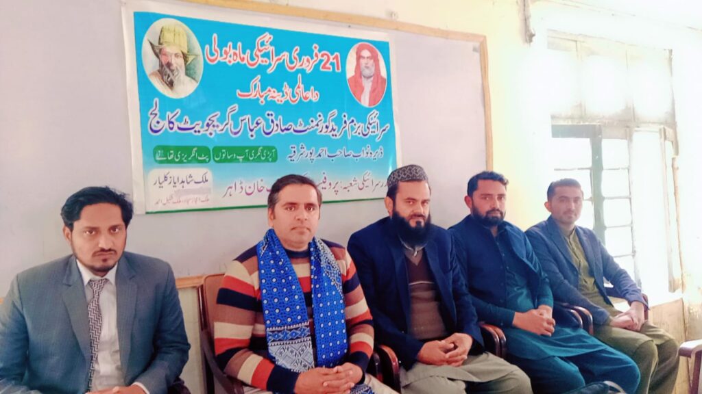 اوچ شریف ،باغی ٹی وی(نامہ نگارحبیب خان) گورنمنٹ صادق عباس گریجویٹ کالج، ڈیرہ نواب صاحب کینٹ احمد پور شرقیہ میں مادری زبانوں کے عالمی دن کی مناسبت سے شعبہ سرائیکی کے زیر اہتمام ایک خصوصی تقریب کا انعقاد کیا گیا۔ تقریب کی صدارت صدر شعبہ سرائیکی پروفیسر ڈاکٹر محمد الطاف ڈاھر جلالوی نے کی، جبکہ طلبہ، اساتذہ اور ماہرینِ تعلیم کی بڑی تعداد نے شرکت کی۔
