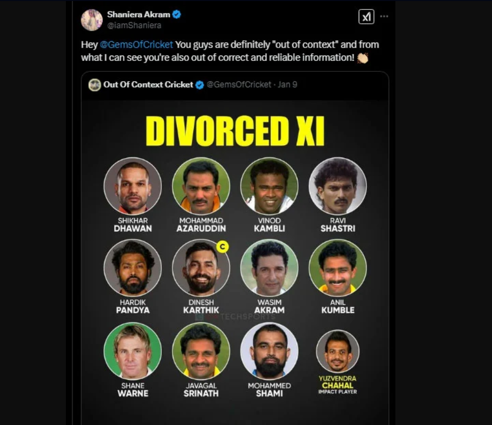 سماجی رابطے کی ویب سائٹ ایکس پر ایک سوشل میڈیا پیج نے دنیا بھر کے مختلف ممالک سے تعلق رکھنے والے 12 کھلاڑیوں کی فہرست جاری کی تھی، جس میں ان کی طلاق ہونے کا دعویٰ کیا گیا تھا۔ اس فہرست میں پاکستانی کرکٹ ٹیم کے سابق کپتان وسیم اکرم اور بھارتی کھلاڑی انیل کمبلے کے نام بھی شامل تھے، حالانکہ حقیقت میں ان دونوں کھلاڑیوں کی طلاق نہیں ہوئی ہے۔سوشل میڈیا کی اس پوسٹ نے فوراً شنیرا اکرم کی توجہ حاصل کی، جنہوں نے جھوٹی معلومات پھیلانے والے سوشل میڈیا پیج کو سخت تنقید کا نشانہ بنایا۔ شنیرا اکرم نے اس پوسٹ کو ری شیئر کرتے ہوئے کہا کہ "بلاشبہ آپ لوگ ہر بات کو سیاق و سباق سے ہٹ کر لکھتے ہیں اور آپ کے پاس درست اور قابلِ اعتماد معلومات نہیں ہیں۔”انہوں نے مزید کہا کہ اس طرح کی خبریں شیئر کرنے سے پہلے ان کی تصدیق ضروری ہے تاکہ حقیقت کا پتہ چل سکے۔