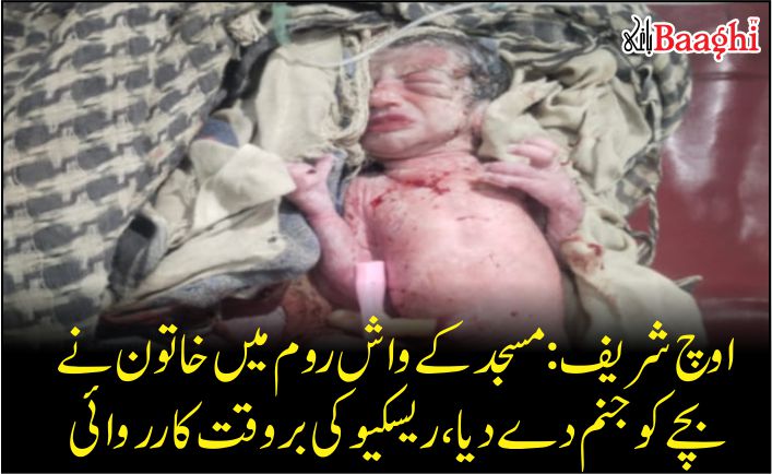 اوچ شریف (باغی ٹی وی نامہ نگار حبیب خان)چاہا بستی چوک میں حیرت انگیز اور غیر معمولی واقعہ پیش آیا جہاں ایک حاملہ خاتون نے جامعہ مسجد کے واش روم میں اچانک بچے کو جنم دے دیا۔ واقعہ کے وقت خاتون نیم بے ہوش تھی جس پر مسجد انتظامیہ اور اہل علاقہ نے فوری طور پر ریسکیو 1122 کو اطلاع دی۔