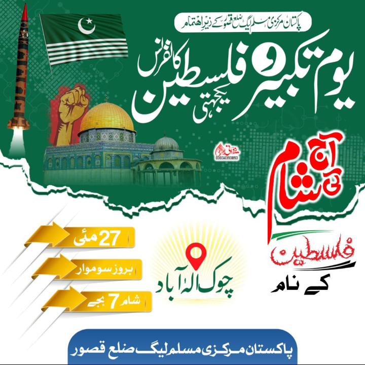 ضلع قصور کی تاریخ کی سب سے بڑی کانفرنس منعقد ہو گی جس میں ہزاروں لوگ شرکت فرمائیں گے نیز ملک بھر سے لوگ شرکت فرمائیں گے اور یوم تکبیر کے موقع پر فلسطینی وفد سے اظہار یکجہتی کرینگے